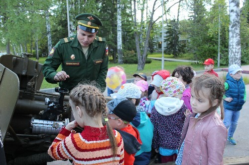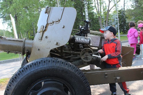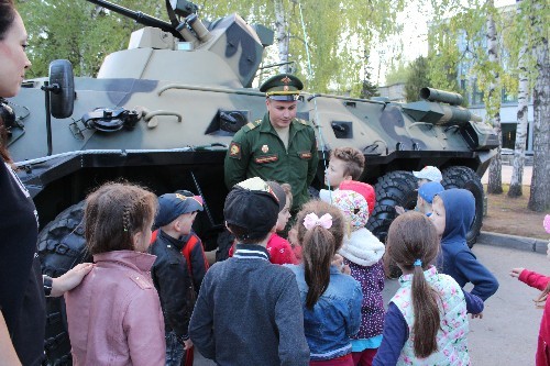 У ребят была возможность посмотреть 2 БТРа, гаубицу, противотанковую пушку и миномет. Старший сержант Михеев Юрий согласился рассказать ребятам о военной технике. Детвора засыпала вопросами молодого военнослужащего.
