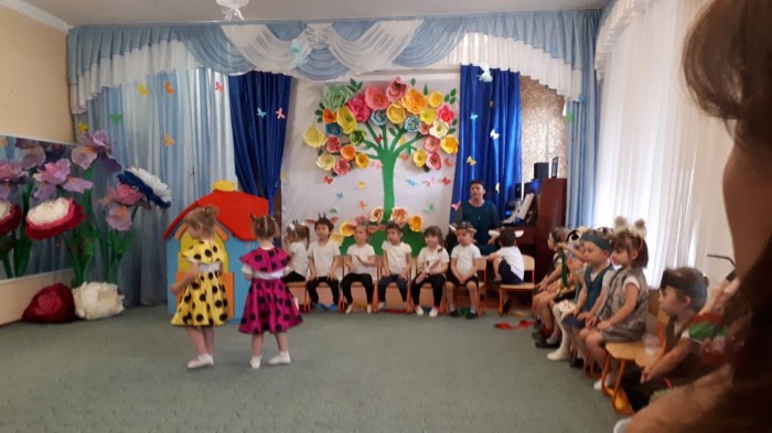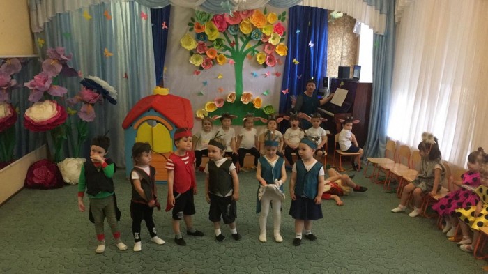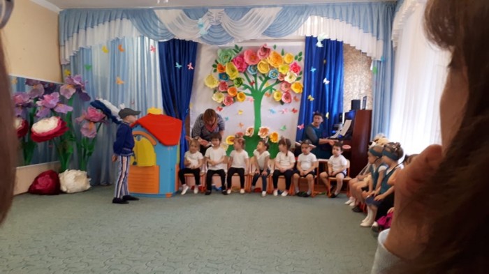 Начиная с апреля, музыкальный руководитель Шипилова Н.Н. разучивала вокальные партии маленьких актеров. Помогали в постановке сказки ребята из подготовительной группы, которые исполнили роли Мамы-козы и Волка. Маку-козу сыграла и спела ее партии Карина Фун Мин Су, а партию Волка исполнял Федор Бикбов.