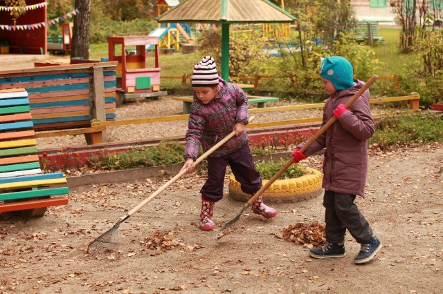Ребята активно помогают убирать свой участок от листьев | |